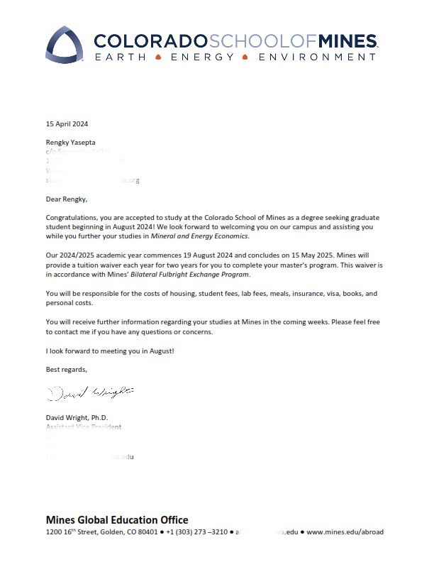 Rasa syukur sekaligus haru juga saya panjatkan karena ternyata saya diterima di sekolah pertambangan nomor 1 di dunia, berdasarkan peringat QS World University Rankings by Subject: Mineral & Mining Engineering 2023, yakni di Colorado School of Mines, Golden, Colorado dengan mengambil jurusan Mineral and Energy Economics. Ingatkah Anda bahwa sebelumnya saya “mati-matian” mengejar beasiswa X untuk bisa berkuliah di kampus pertambangan nomor 2 di dunia? Ternyata rencana Allah lebih indah. Di balik kegagalan saya yang terus-menerus (baca: ngotot) mengejar beasiswa X, Allah berikan ending yang lebih baik. Saya justru mendapat kesempatan berkuliah di kampus nomor 1 sedunia, alih-alih mendapatkan yang nomor 2, untuk kategori jurusan yang saya tekuni, yakni pertambangan.